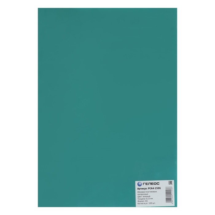 Обложки для переплета A4, 150 мкм, 100 листов, пластиковые, прозрачные зеленые, Гелеос