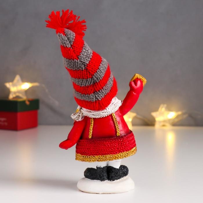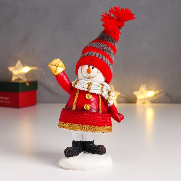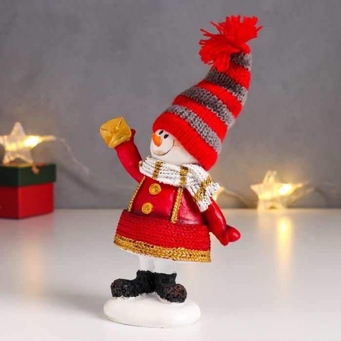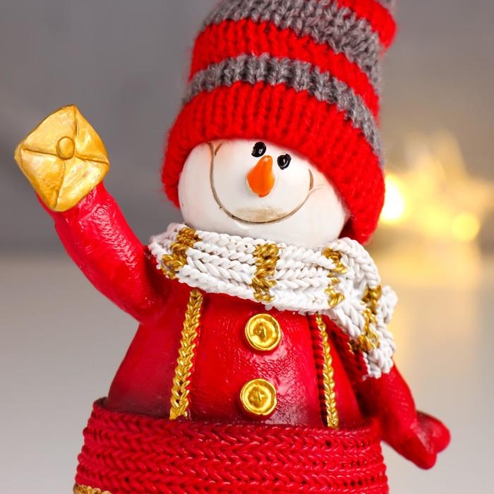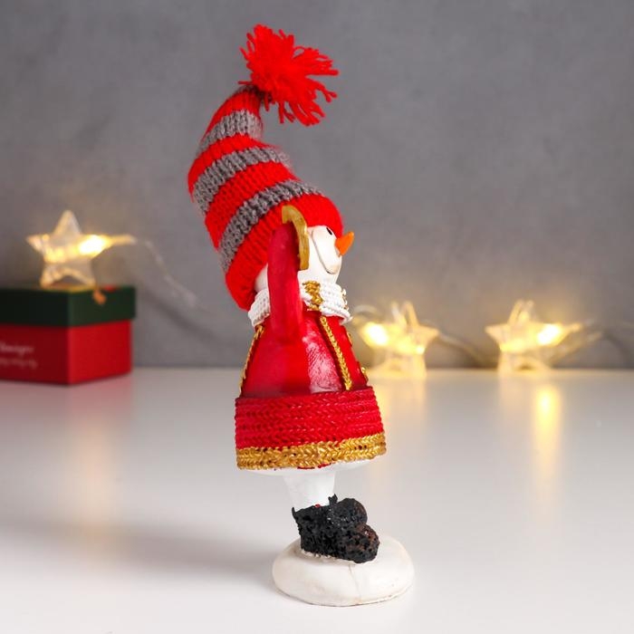 Сувенир полистоун "Снеговик в красной шубе, полосатом колпаке и шарфике" 14х10,5х5 см