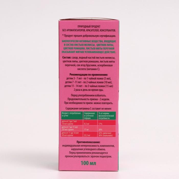 Назначение: рекомендован в качестве дополнительного источника витамина С.Продукт прошел добровольную сертификацию. Оказывает общеукрепляющее действие и способствует улучшению защитных сил организма к воздействию неблагоприятных факторов окружающей среды в осенне-зимний период. Биологически активные вещества цветков липы, травы душицы, шиповника и облепихи способствуют выздоровлению при простуде и гриппе, оказывая противовоспалительное, антимикробное, потогонное и жаропонижающее действие. Обладает природным вкусом и ароматом липы и душицы. Пищевая ценность 100 г продукта: белки – 0 г, жиры – 0 г, углеводы – 67 г. Энергетическая ценность 100 г продукта: 1139 кДж/268 ккал. Срок годности – 18 месяцев. Хранить в сухом, защищенном от воздействия прямых солнечных лучей месте при температуре от 0˚С до 25˚С. После вскрытия флакон хранить в холодильнике не более 14 суток.**Способ применения:** детям 3-7 лет по 1 чайной ложке (5 мл), детям 7-11 лет по 1 чайной ложке (5 мл), детям 11-14 лет по 2 чайные ложки (10 мл) 3 раза в день во время еды. Продолжительность приема – 2 недели.**Состав:** сахар, водный настой листьев мелиссы, цветков липы, цветков ромашки, листьев мяты перечной, сок ягод брусники, аскорбиновая кислота (витамин С). Полное отсутствие консервантов, красителей, ароматизаторов и химических добавок!**Противопоказания:** индивидуальная непереносимость компонентов продукта, нарушения углеводного обмена. Перед применением рекомендуется проконсультироваться с врачом педиатром.