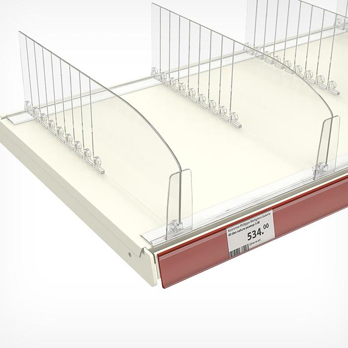 Широкий усиленный Т-профиль для крепления разделителей, толкателей и ребристого профиля задней опоры. Ширина – 28 мм. Крепится на полку вспененным скотчем.