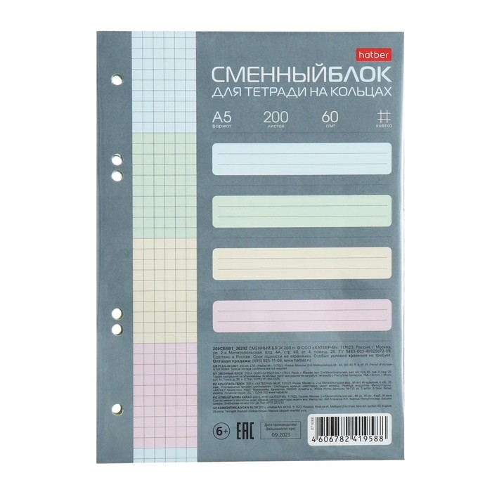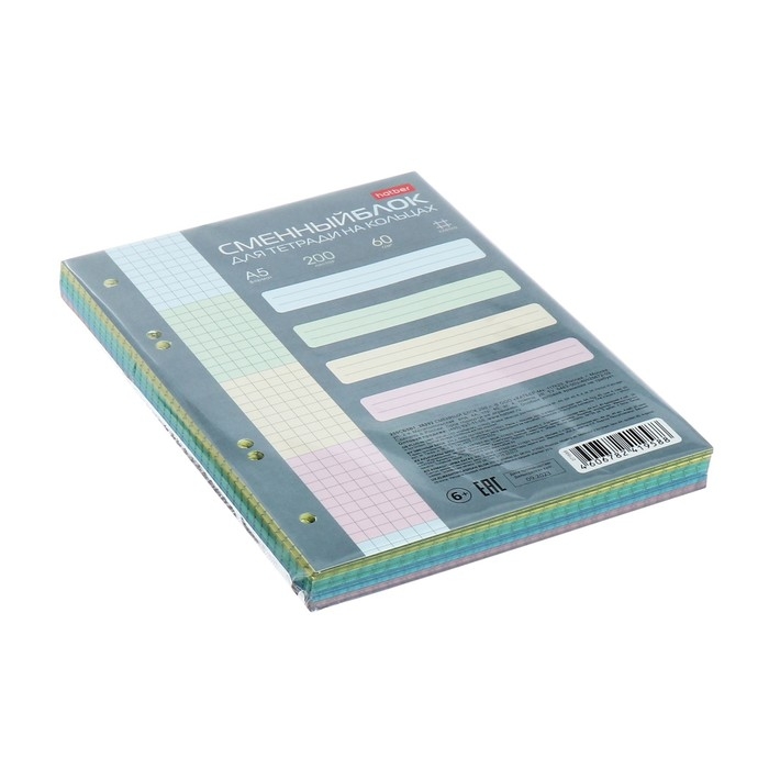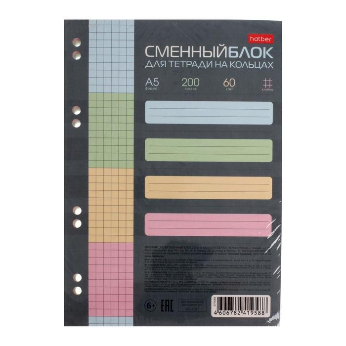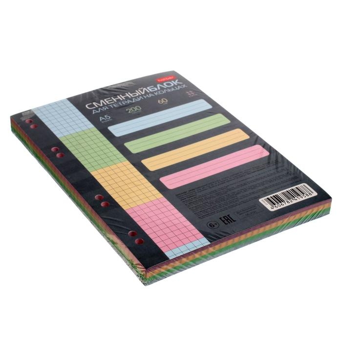 Сменный блок для тетрадей на 4-х кольцах А5, 200 листов в клетку, индивидуальная упаковка, тонированный блок, 4 цвета