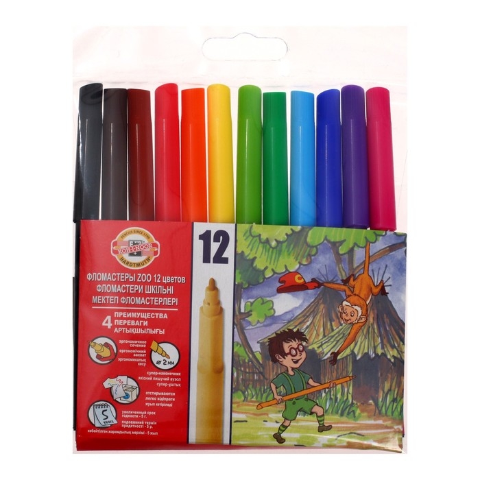Фломастеры 12 цветов Koh-I-Noor Звери 1002, трехгранные, упаковка ПВХ, европодвес