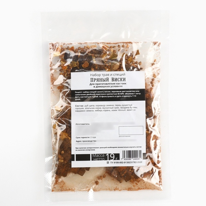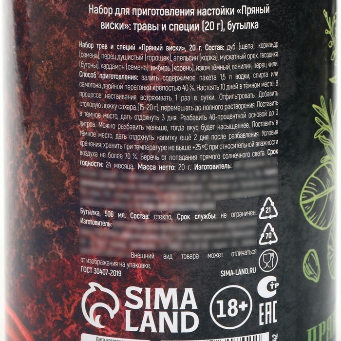 Подарочный набор для приготовления настойки «Пряный виски», набор трав и специй 20 г., бутылка 500 мл., инструкция