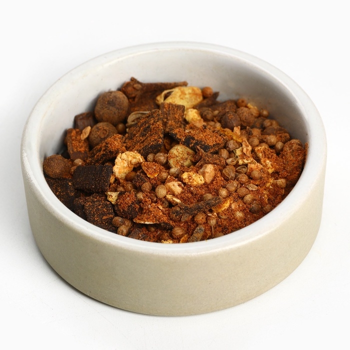 Состав: корица, гвоздика, перец душистый, имбирь сушёный, мускатный орех, цедра апельсина, перец чили, кардамон, ванилин.