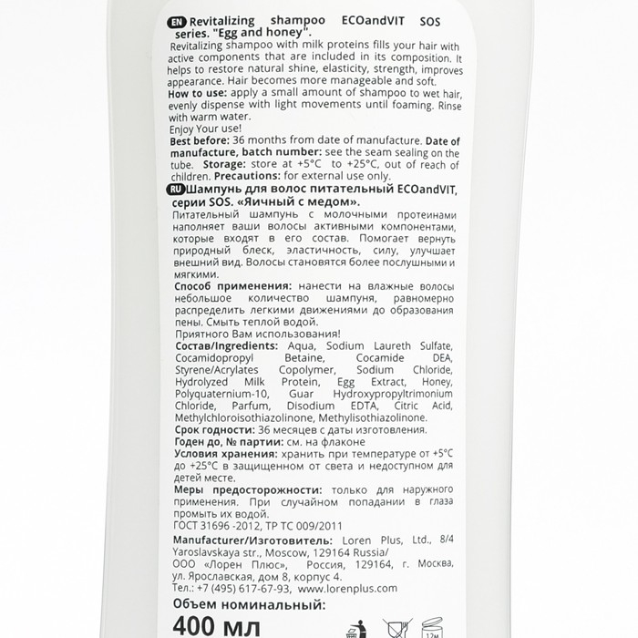Шампунь для волос питательный ECOandVIT SOS "Яичный с медом", 400 мл
