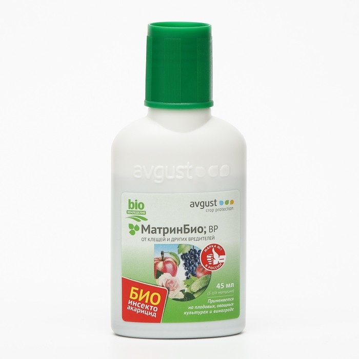 МатринБио - уникальный на российском рынке натуральный биопрепарат для защиты цветочных культур и комнатных растений от клещей и других вредителей. Высокоэффективен против клещей (войлочный клещ (зудень), паутинный клещ и другие), тепличной белокрылки, тли, трипсов, цикадок, совок, гроздевой листовёртки и прочих.