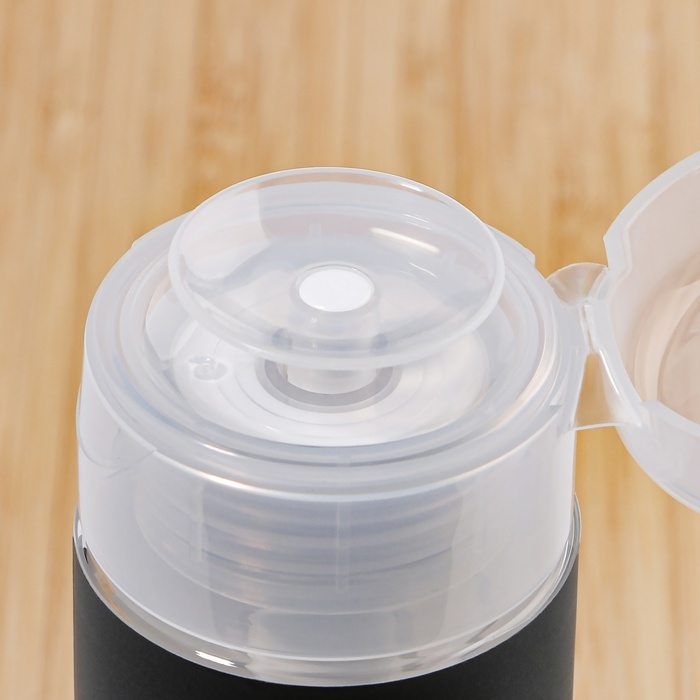 Чёрно-белый флакон с дозатором из прочного пластика обладает объемом 150 мл, что делает его идеальным для хранения различных жидкостей. Его эксклюзивный дизайн придаёт утончённый вид и подчёркивает высокий статус. Компактные размеры и продуманная форма позволяют удобно размещать его в любой косметичке или на полке в ванной комнате.
