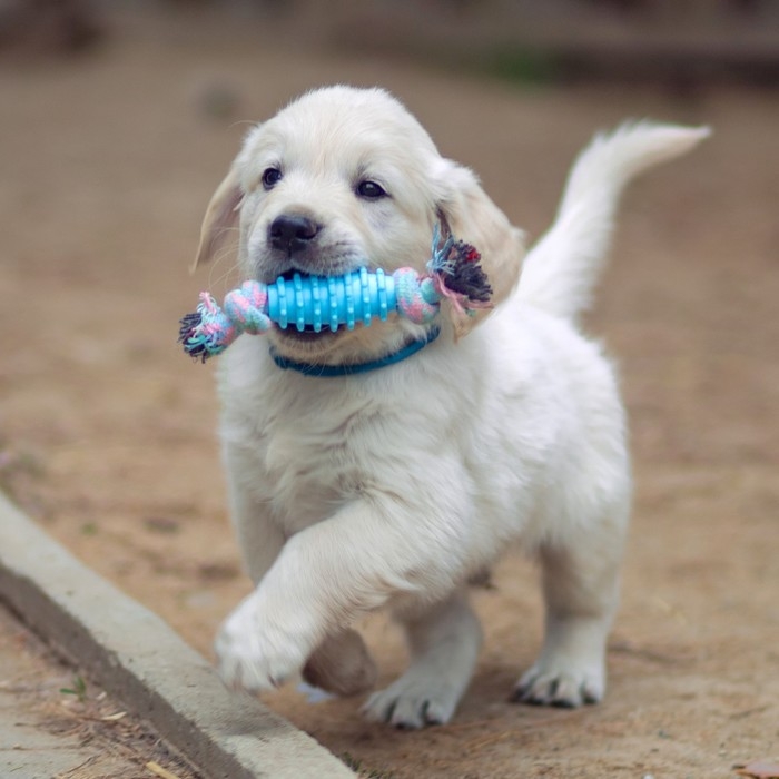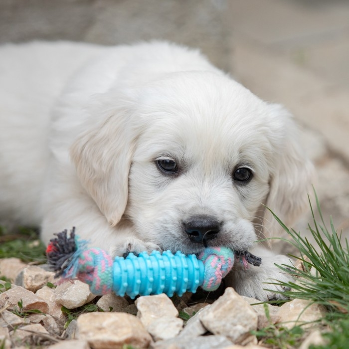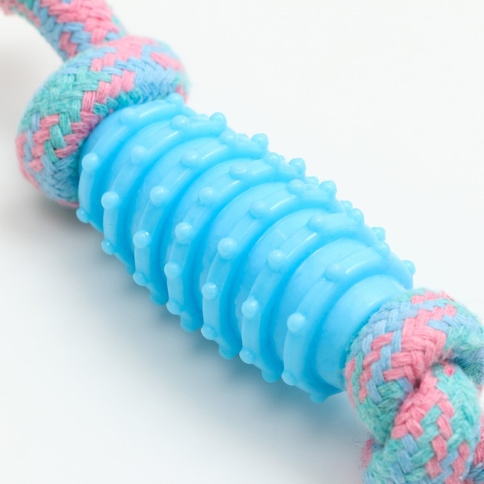 Хлопковый канат с узлами чистит зубы собаки во время игры, что способствует сохранению здоровья полости рта.