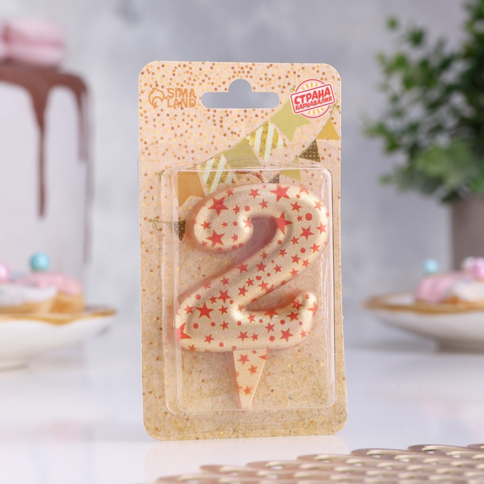 Свеча в торт "Саната", цифра "2", золотая с красными звездами, 5,5 см