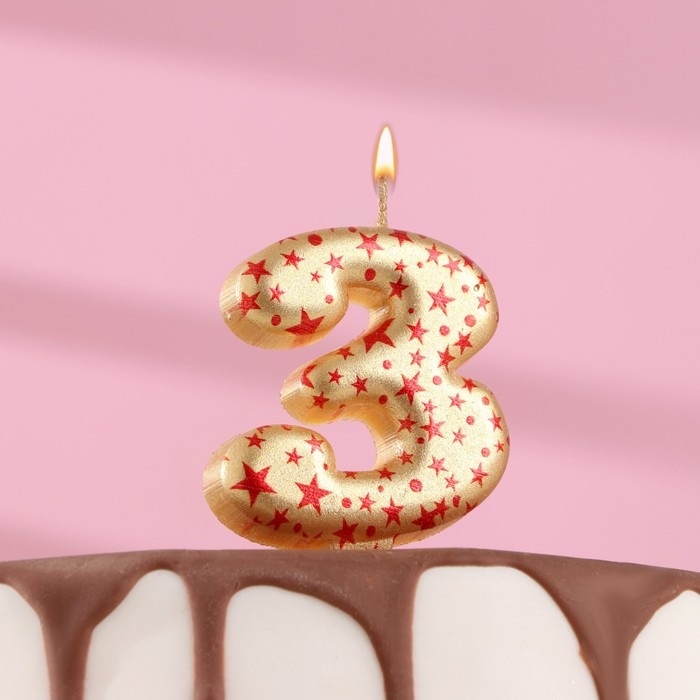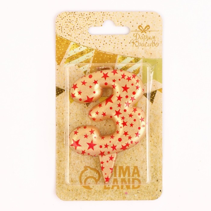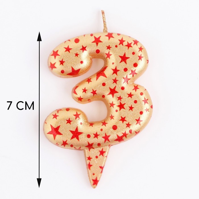 Свеча в торт "Саната", цифра "3", золотая с красными звездами, 5,5 см