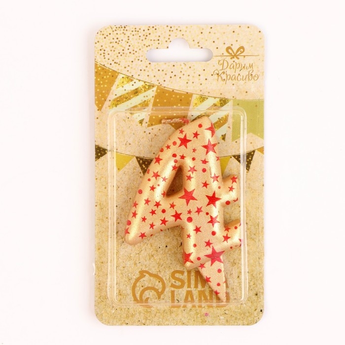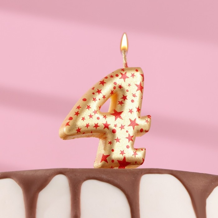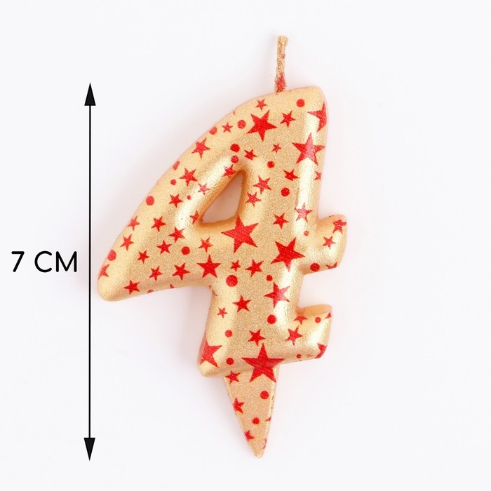 Свеча в торт "Саната", цифра "4", золотая с красными звездами, 5,5 см