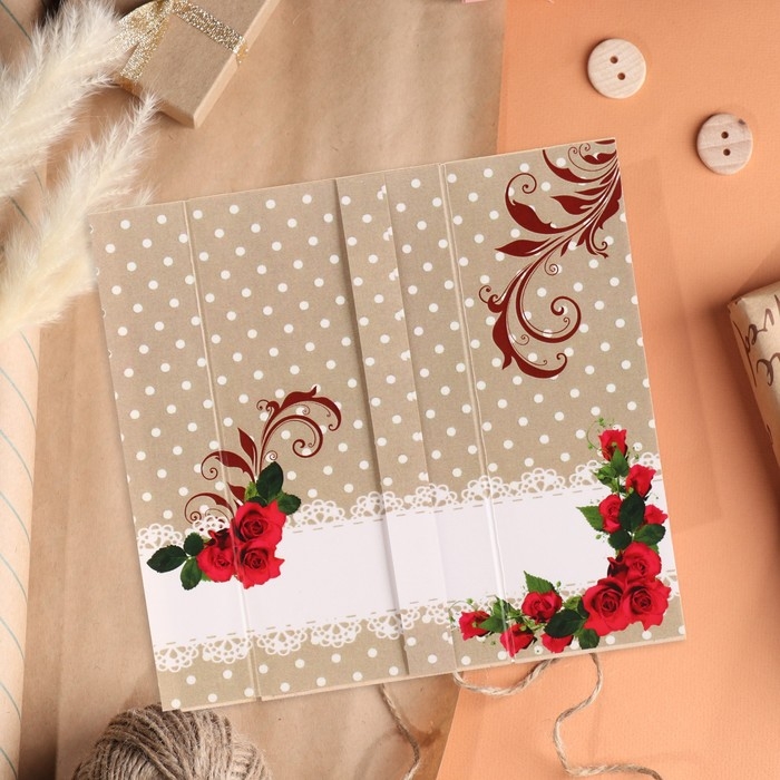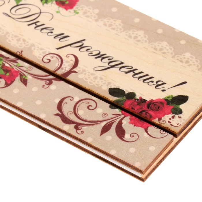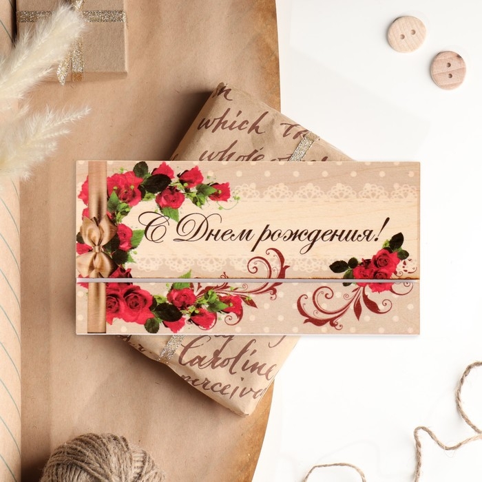 Конверт деревянный резной "С Днём Рождения!" розы, золотой бант