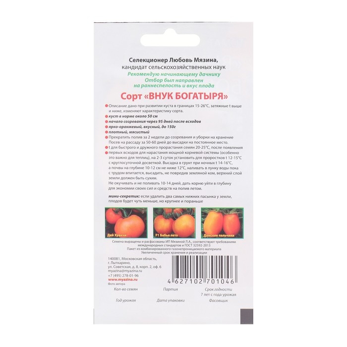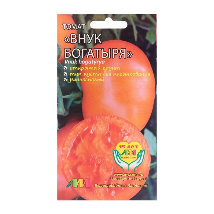 Томат "Внук богатыря" – детерминантный невысокий сорт. Предназначен для посадок на открытых, пленочных и застекленных грядках. Низкорослые кусты вырастают до 0, 6 м., что значительно упрощает уход. Побеги характеризуются средней степенью облиственности, но при этом они мощные и не ломаются под тяжестью помидоров. Созревание дружное со средними сроками – через 110-115 дней после всходов.