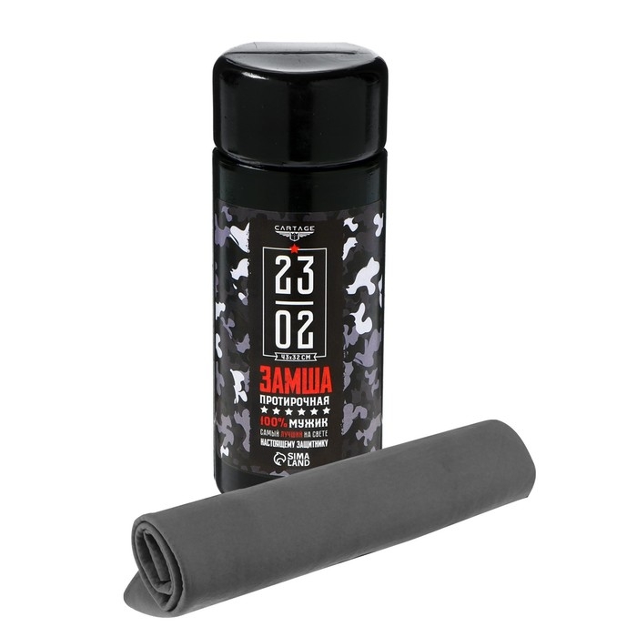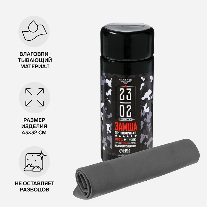 Замша протирочная Cartage, размером 43х32 см, станет отличным дополнением к любому автомобилю. Она предназначена для протирки стекол, фар и поверхности кузова, а также для удаления влаги и грязи. Особенностью данной замши является ее дизайн, выполненный в тематике праздника 23 февраля.