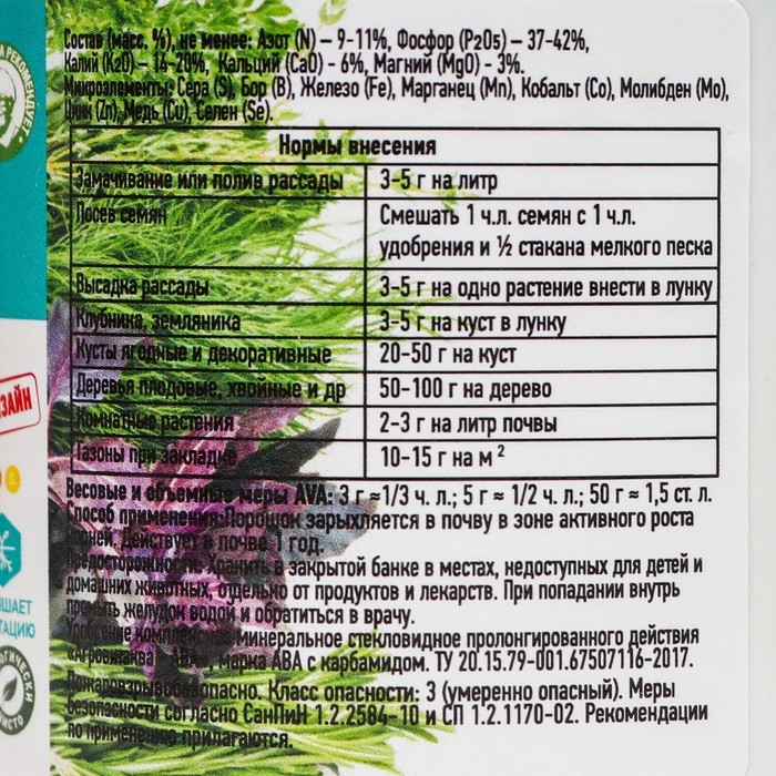 Фосфор (P2O5) - 47-52%, Калий (K2O) - 18-22%, Кальций (CaO) - 8%, Магний (MgO) - 4%, Кремний (Si) - 1-1,5%.