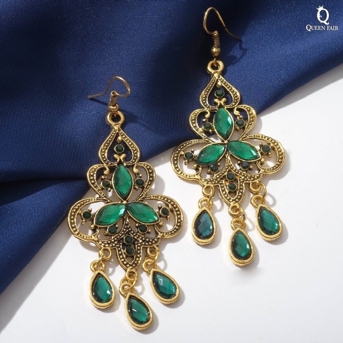 Серьги висячие со стразами «Восток» трилистник, цвет зелёный в чернёном золоте, 8 см