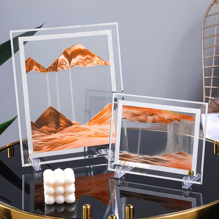 Вы воздействуете одним прикосновением, когда рамка переворачивается, песок начинает произвольно струиться вниз, огибая пузырьки жидкости, образуя удивительной красоты пейзажи. Наблюдение за этим процессом позволяет человеку расслабиться, отдохнуть, успокоить нервы.