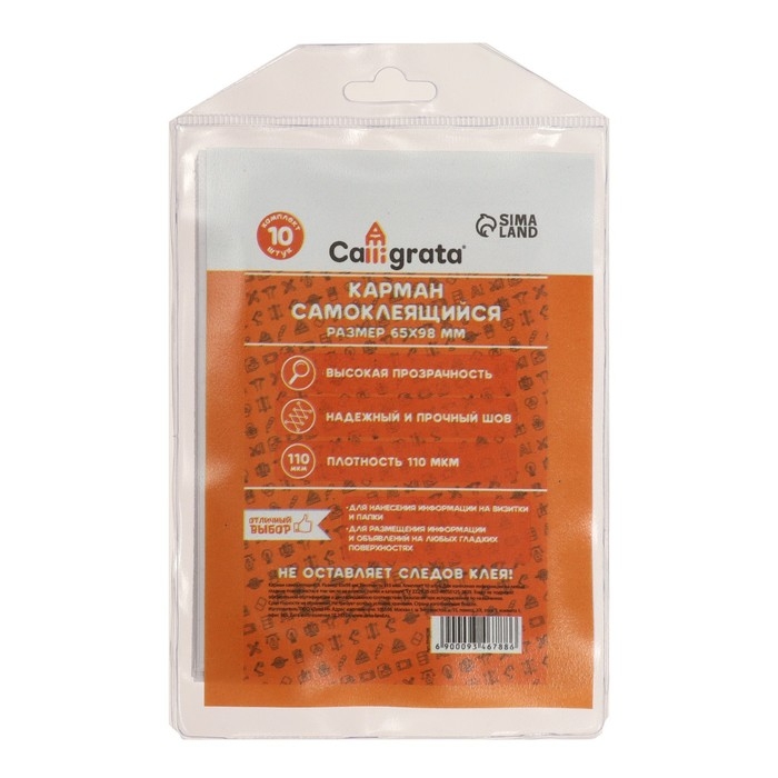Самоклеящиеся карманы предназначены для нанесения информации на визитки, папки и любые гладкие поверхности. Выполнены из прочного ПВХ плотностью 110 микрон и имеют фактуру под апельсиновую корку и прочный шов. Клейкий, прозрачный слой позволяет разместить карманы на любых гладких поверхностях, при переклеивании не оставляет следов. Размер кармана - 65 х 98 мм. 10 штук в комплекте. С самоклеящимися карманами CALLIGRATA ни одна важная информация не останется незамеченной!