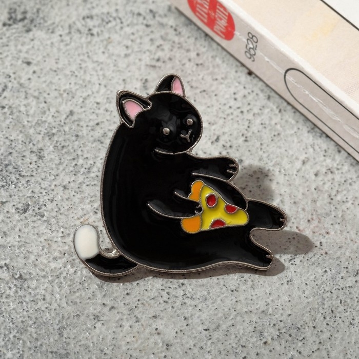 Значок «Кот» с пиццей, цветной в серебре