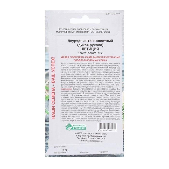 Семена Двурядник тонколистный, дикая рукола Летиция, 0,3 г
