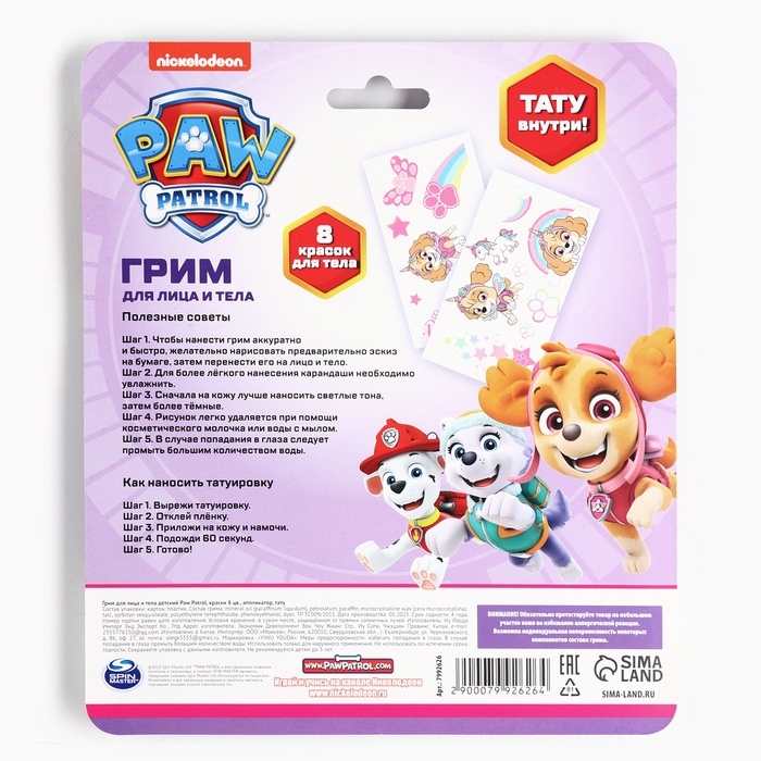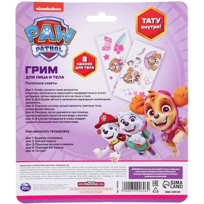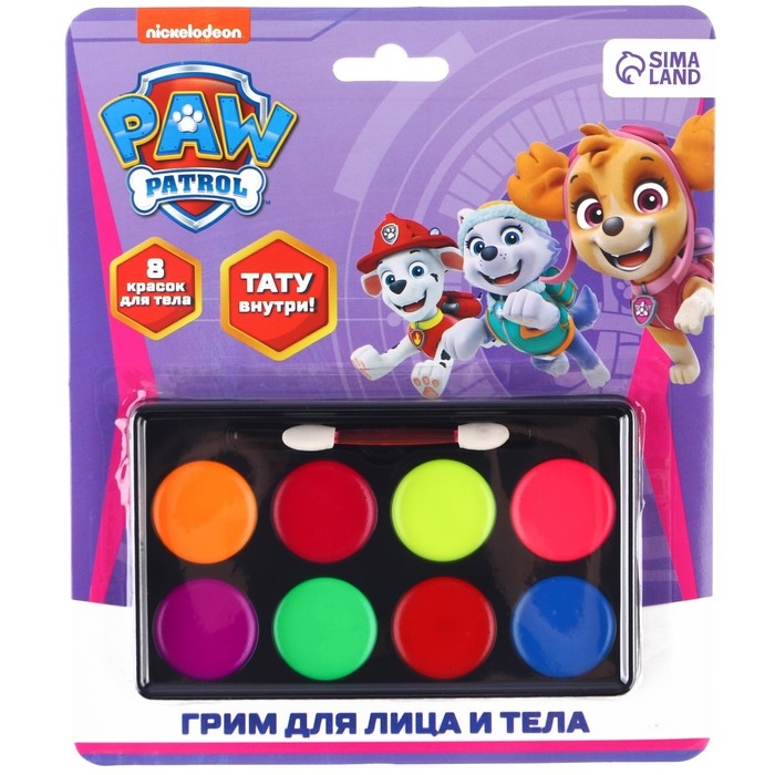 Грим для лица и тела, карандаши 6 цветов, блестки, аппликатор, тату "Cкай", Щенячий патруль