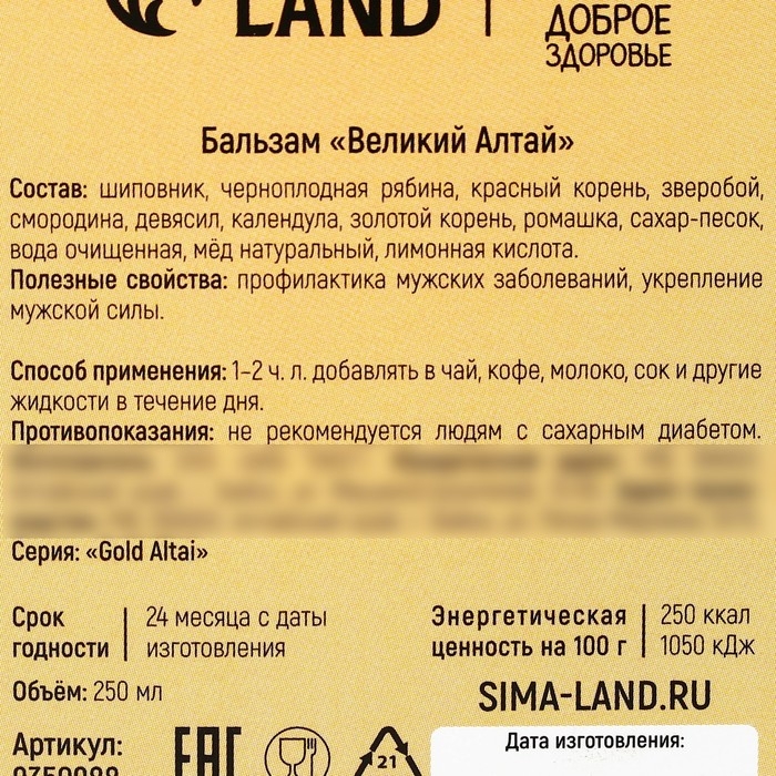 Состав: шиповник, черноплодная рябина, красный корень, зверобой, смородина, девясил, календула, золотой корень, ромашка, сахар-песок, вода очищенная, мёд натуральный, лимонная кислота.