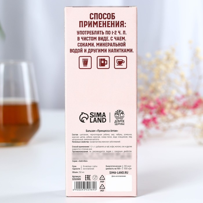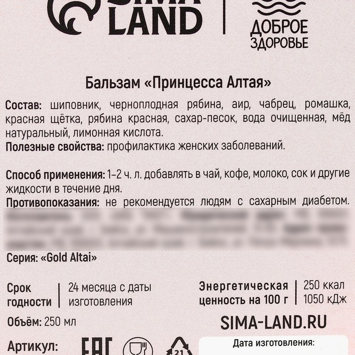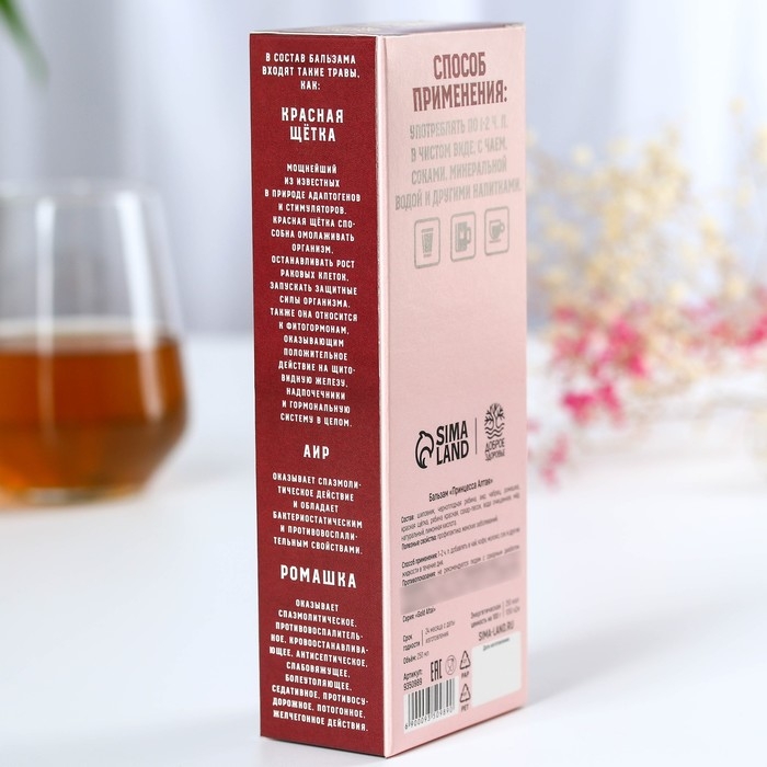 Состав: шиповник, черноплодная рябина, аир, чабрец, ромашка, красная щётка, рябина красная, сахар-песок, вода очищенная, мёд натуральный, лимонная кислота.