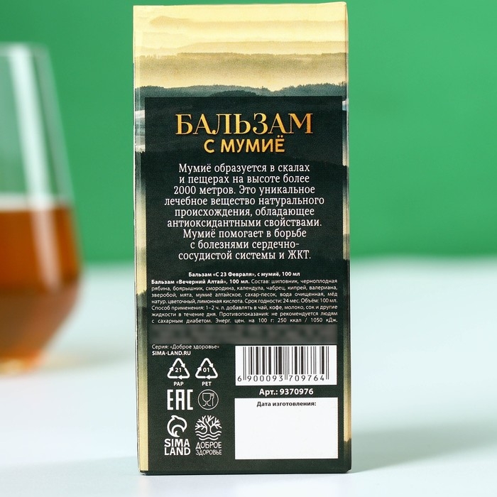 Бальзам с мумиё «С 23 февраля»: шиповник, черноплодная рябина, боярышник, смородина, календула, зверобой, 100 мл.