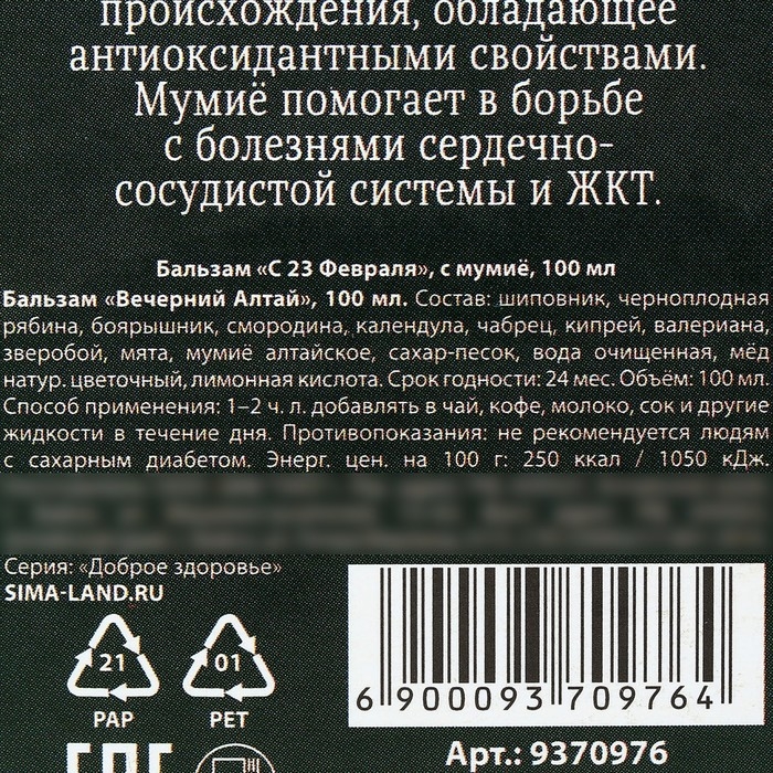 Состав: шиповник, черноплодная рябина, боярышник, смородина, календула, чабрец, кипрей, валериана, зверобой, мята, мумиё алтайское, сахар-песок, вода очищенная, мёд натуральный цветочный, лимонная кислота.