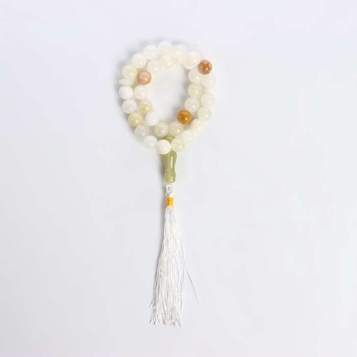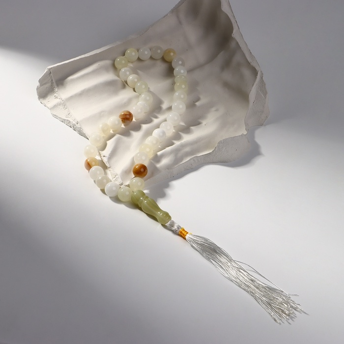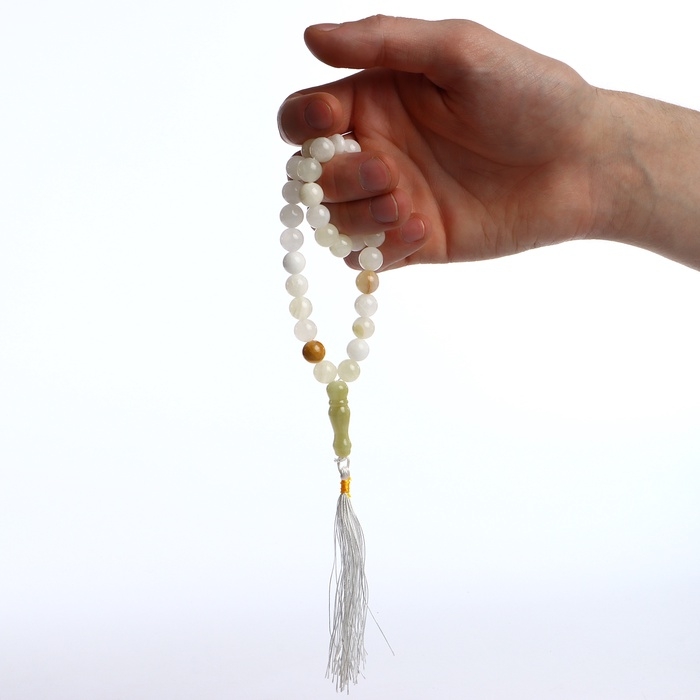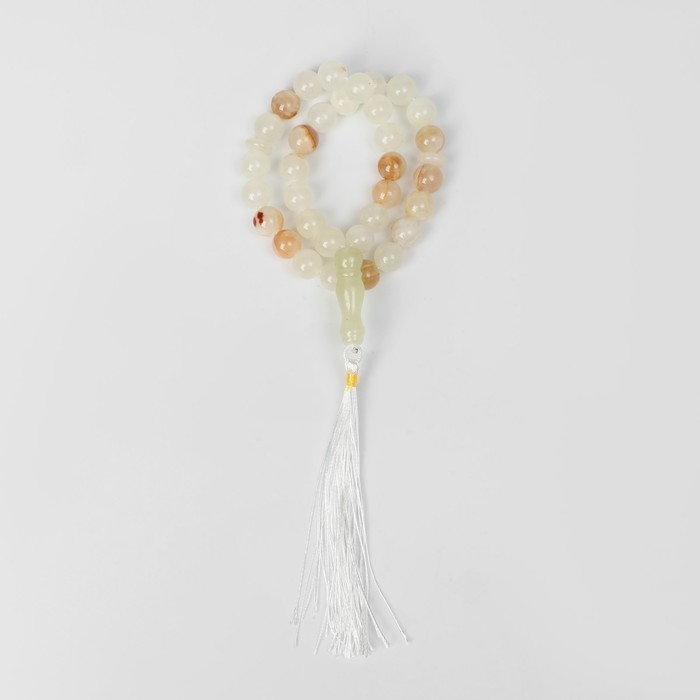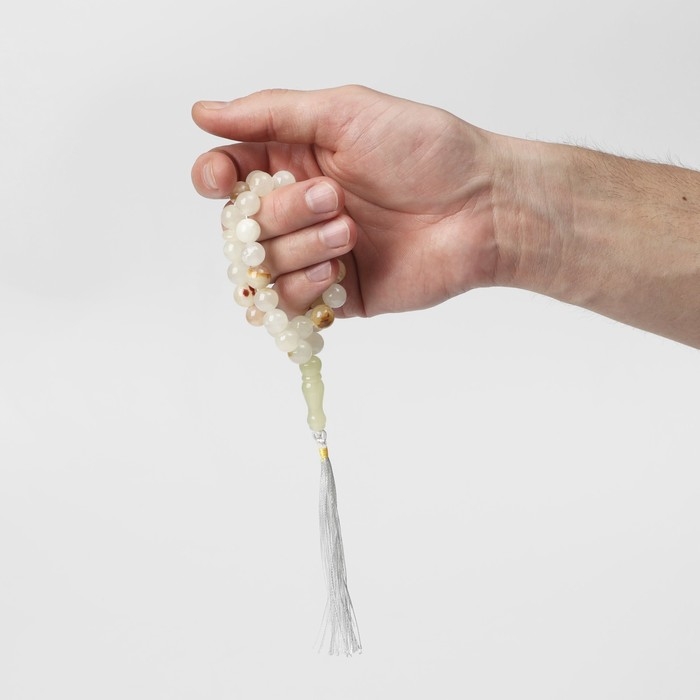 Мусульманские чётки «Светлый оникс» изготовлены из прессованного камня, имеют 33 бусины размером 1 см через декоративную перемычку из бижутерного сплава и текстильную кисточку. Аксессуар предназначен для достижения концентрации и покоя во время медитации, также часто используется как стильное украшение на шею, зеркало машины, оберег или амулет.