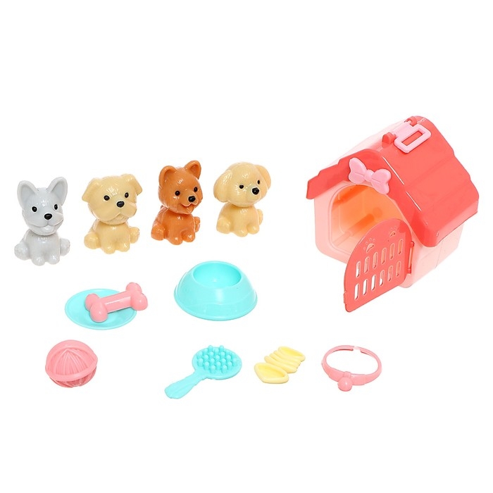 - Аксессуары для животных: будка-домик, миска, тарелка, мячик, кость, рыбка, расчёска, ошейник.