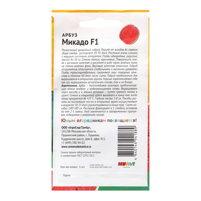 Микадо F1 – среднеспелый диплоидный гибрид арбуза (70-75 дней от всходов до начала плодоношения). Рекомендуется для выращивания в открытом грунте. Растение сильное, среднеплетистое с мощной, активно развивающейся корневой системой. Лист от среднего до крупного, сильно рассеченный, темно-зеленый.