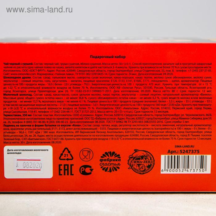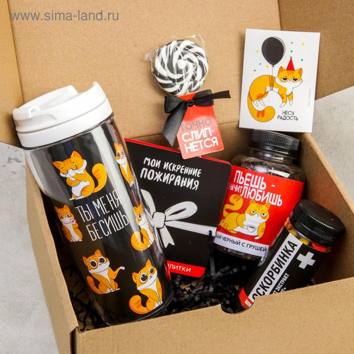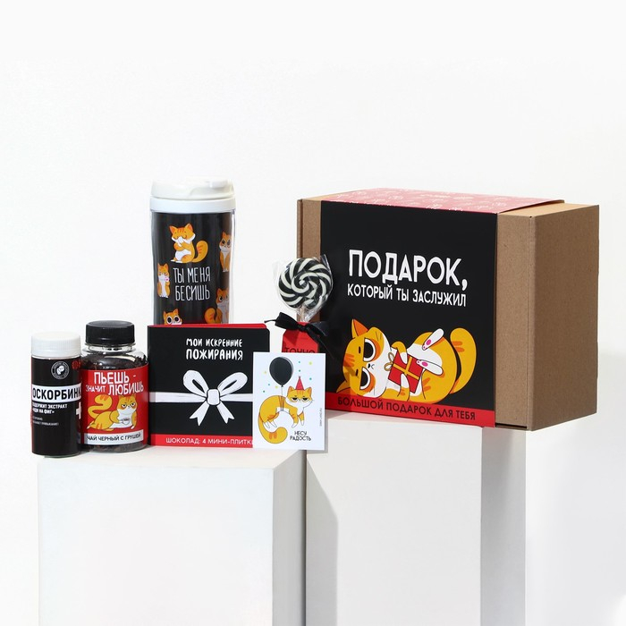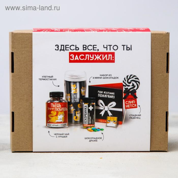 Гифтбокс «Подарок, который ты заслужил», чай 50 г., термостакан 350 мл., драже шоколадное 80 г., шоколад 4 шт. * 5 г., леденец 30 г.