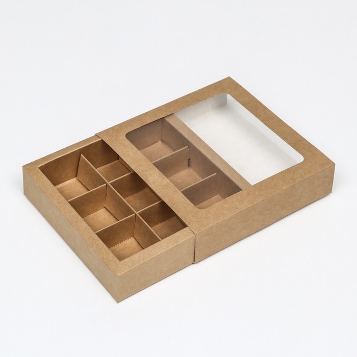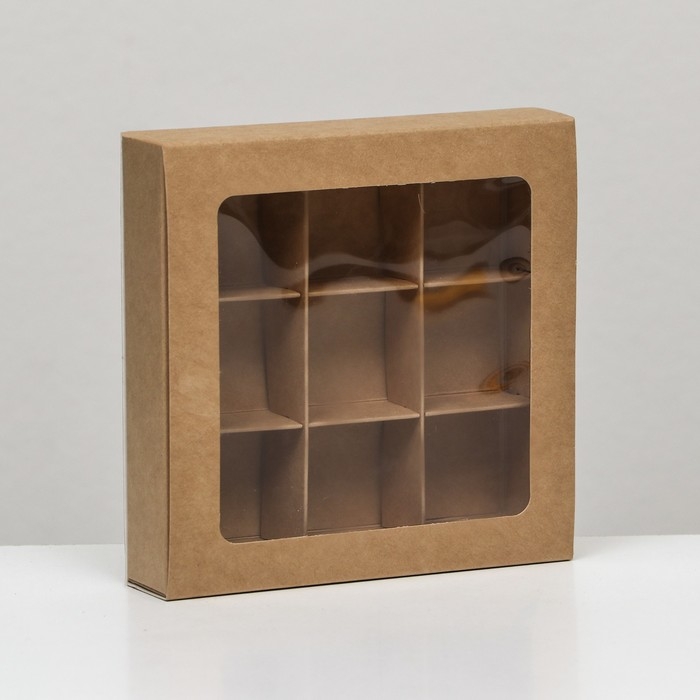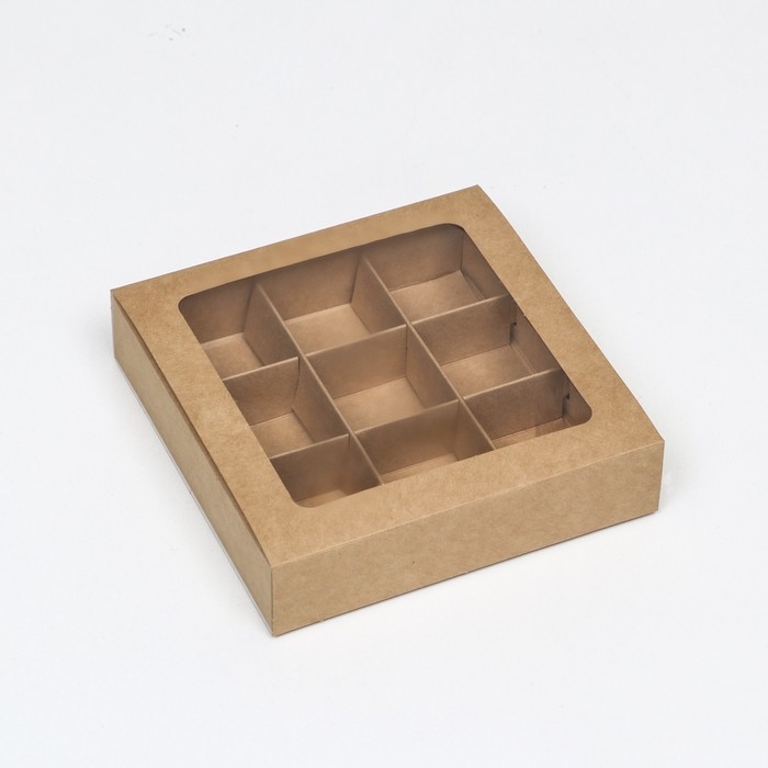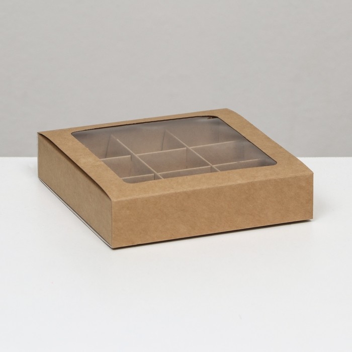 Коробка под 9 конфет с обечайкой, с окном, с тонкими разделителями, крафт 14,7х14,7х3,4 см