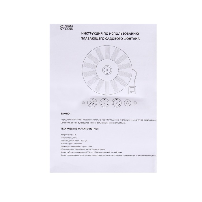ВАЖНО! Поскольку фонтан работает от солнечного света, рекомендуем устанавливать его в солнечной части участка. Чем ярче свет, тем интенсивнее происходит разбрызгивание воды.
