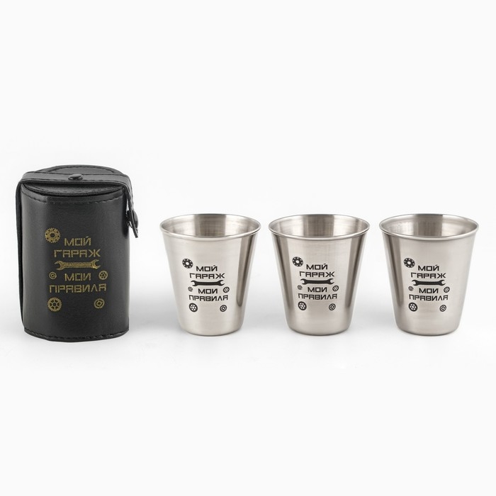 Набор стопок из 3 штук по 70 мл из пищевой нержавеющей стали в компактном чехле. Легкие и компактные, удобно брать с собой на отдых, рыбалку, охоту, природу или в путешествия.
