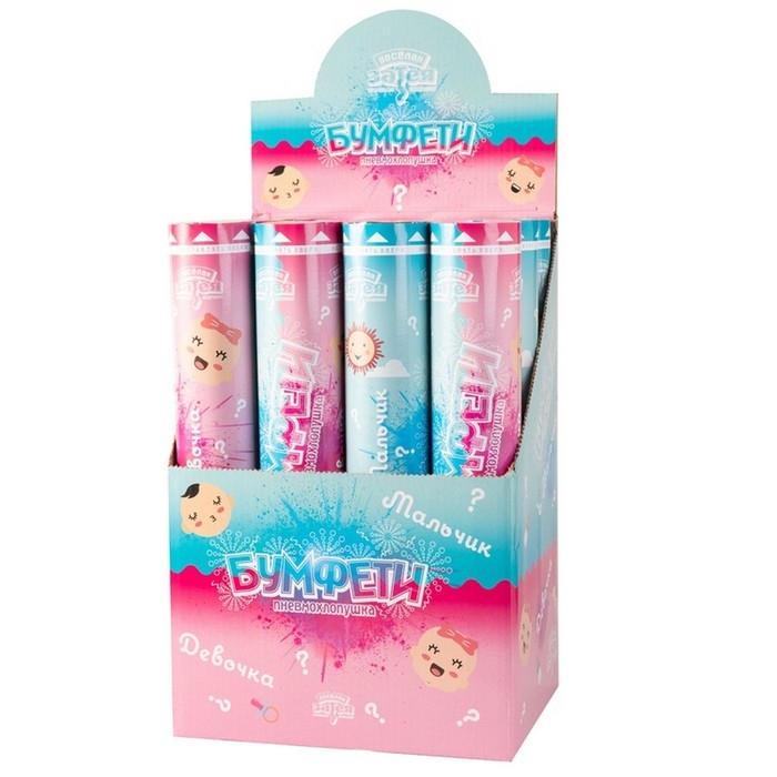 Гендер пати — популярный праздник, который устраивают родители в ожидании пополнения. Пневматическая хлопушка поможет эффектно объявить пол будущего малыша на этом празднике! Она подарит массу положительных эмоций для всех гостей.