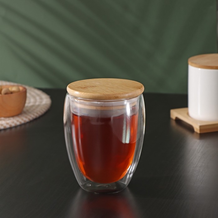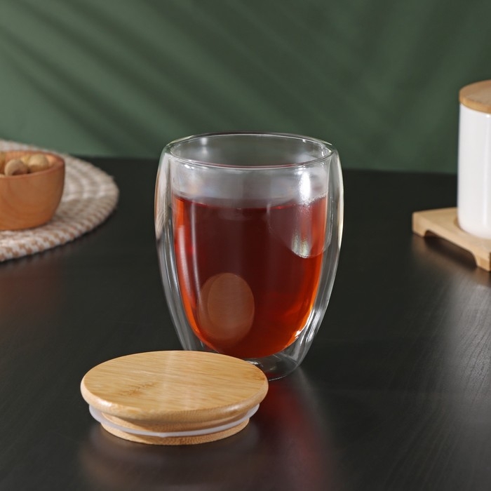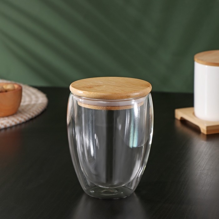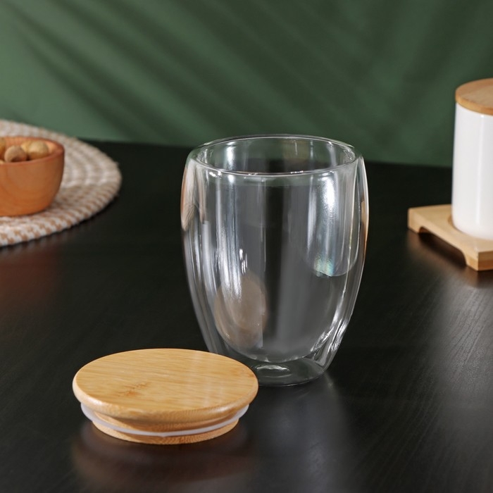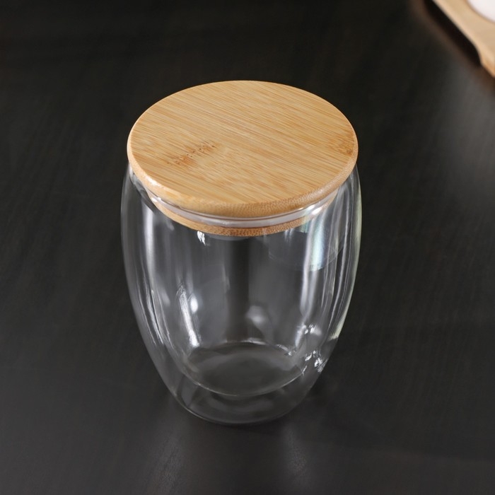 Стакан стеклянный с двойными стенками и бамбуковой крышкой BellaTenero «Эко», 330 мл