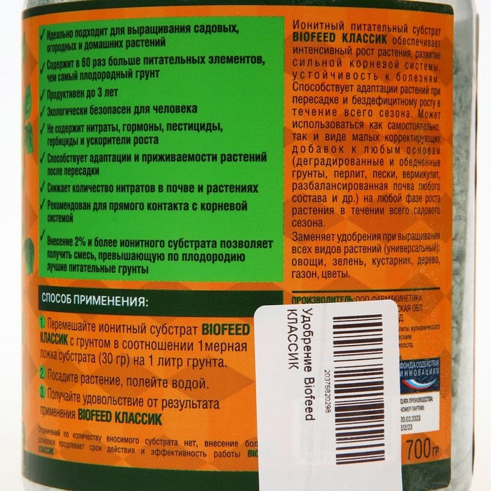 Способ применения: Перемешайте ионитный субстрат BIOFEED КЛАССИК с грунтом в соотношении 1мерная ложка субстрата (30 гр) на 1 литр грунта. Посадите растение, полейте водой. Получайте удовольствие от результата применения BIOFEED КЛАССИК. Ограничений по количеству вносимого субстрата нет, внесение больших дозировок продлевает срок действия и эффективность работы BBIOFEED КЛАССИК.