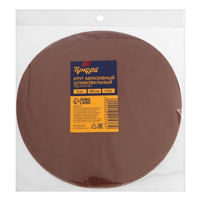 Круг абразивный шлифовальный под "липучку" ТУНДРА, 180 мм, Р120, 5 шт.