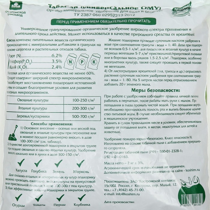 ОМУ «Табасап» - это комплексное гранулированное органическое удобрение по «скорости» прямого действия на растения сопоставимо с минеральными удобрениями, внесенными в эквивалентном количестве по азоту, фосфору и калию, а впоследействии, превосходящее их, что позволяет уменьшить дозу вносимых минеральных удобрений на 30%. Препарат в пересчете на абсолютно сухое вещество содержит: азот – ≥6%; фосфор – ≥3.5%; калий – ≥2.5%.