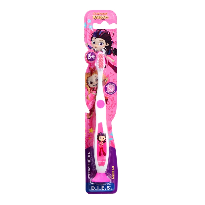 Зубная щётка D.I.E.S. для детей от 3 до 9 лет с мягкой щетиной бережно удаляет налёт с зубов и предотвращает появление зубного камня. Утончённая щетина обеспечивает бережный уход за зубами, не травмирует чувствительные детские дёсны и не царапает эмаль молочных зубов. Маленькая голова щётки позволяет тщательно очистить полость рта даже в самых труднодоступных местах. Мягкое прорезиненное покрытие ручки исключает скольжение. Ручка удобна в использовании. Ручка с присоской обеспечивает удобное хранение щётки в ванной.