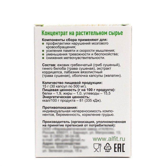 Концентрат на растительном сырье Ежовик с гинкго билоба, 30 капсул по 500 мг
