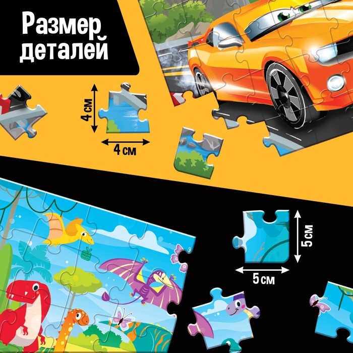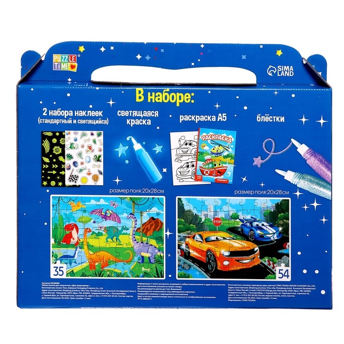 - Ребёнок соберёт 2 пазла с разным количеством деталей и украсит их декором из набора.