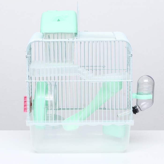Клетка оборудована игровой площадкой с домиком, в котором грызун может не только развлекаться, но и спрятаться и чувствовать себя в безопасности.