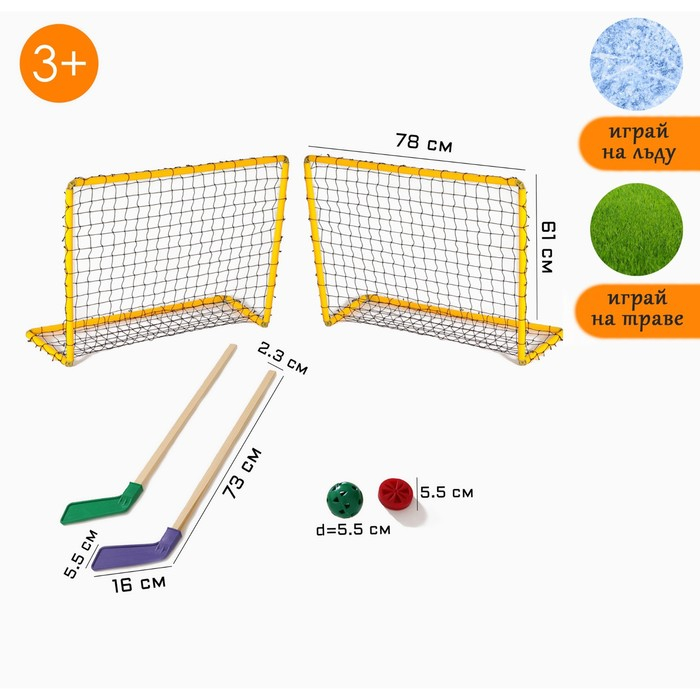 Хоккейный набор 3 в 1, 2 клюшки 73 см, ворота 4 штуки, 2 мяча d-5.5 см, клин 8 штук