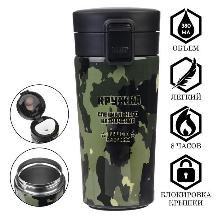 Термокружка для кофе и чая "Мастер К" идеальна для офиса, автомобиля, длительных прогулок и детям в школу. Благодаря специальному покрытию надежно лежит в руке.