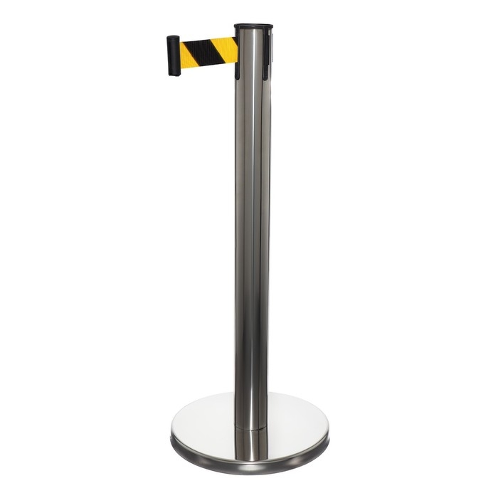 Стойка ограждения серебряная, с вытяжной лентой-280 см желтая,черный, высота-90см, d- 6см, напольный d-32см