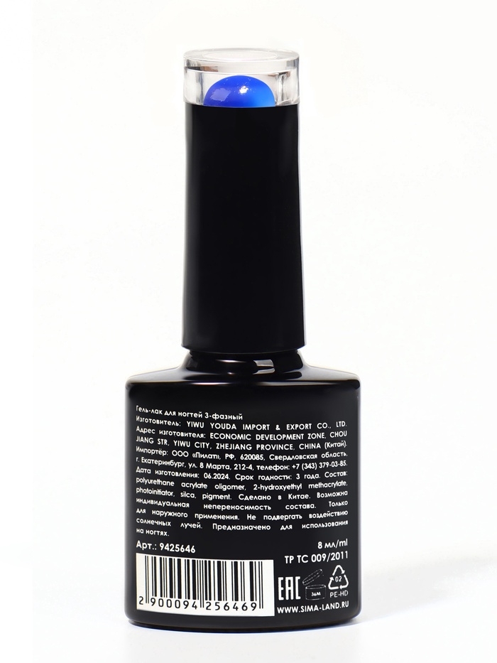 Гель лак для ногтей, неоновый, 3-х фазный, 8 мл, LED/UV, цвет синий с блёстками (38)