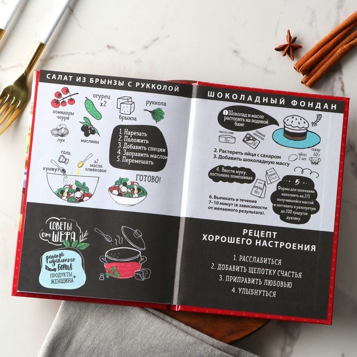 Ежедневник для записи рецептов - Отличный помощник на кухне, он всегда будет под рукой, в отличие от любых электронных аналогов. Записи позволят не забыть про удачный рецепт, который снова захотите повторить. Для удобства использования, вы можете отмечать сложность, время приготовления, где готовится и количество порций, для каждого рецепта, а так же записывать весь процесс приготовления. Благодаря твердой обложке он прослужит долгие годы. А универсальный формат, не займет много места на вашей кухне.
